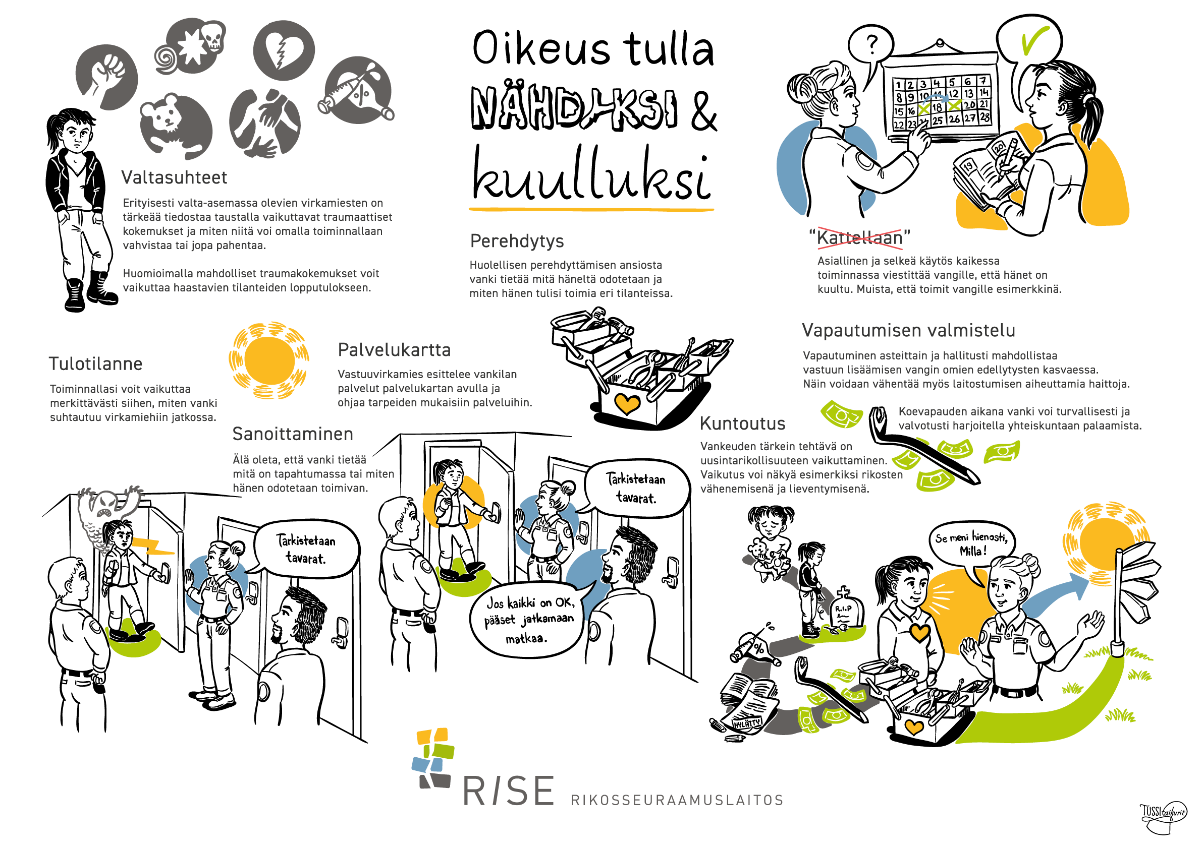 Naiserityisestä työstä tehdyt julisteet Rikosseuraamuslaitokselle ohjeistukseksi ja taustatiedoksi naisvankien parissa työskenteleville. Kuvat ovat esillä myös naiserityisestä työstä tehdyllä Tussitaikureiden piirrosvideolla tusseilla piirrettynä.